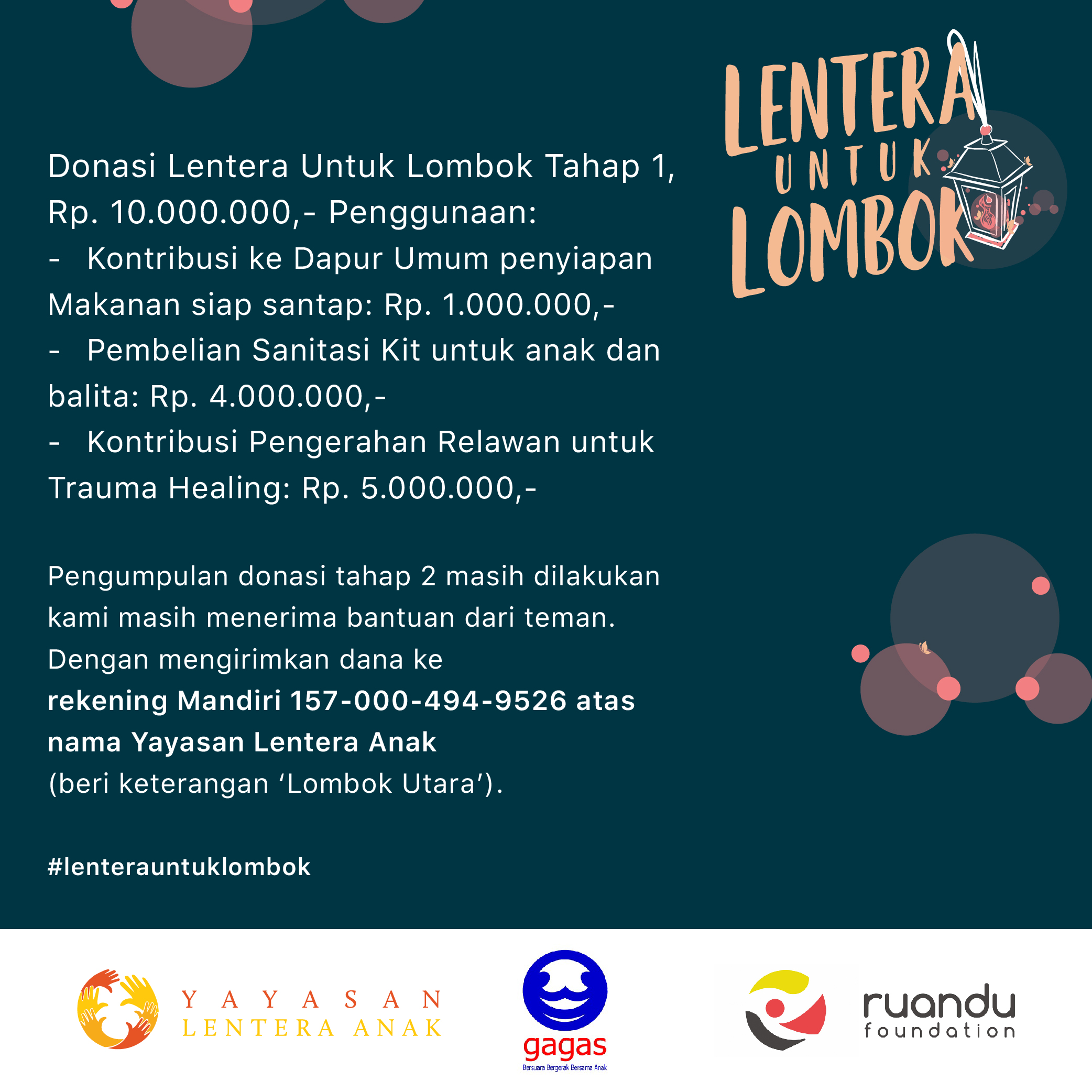 157-000-494-9526 (Mandiri) AN. Yayasan Lentera Anak